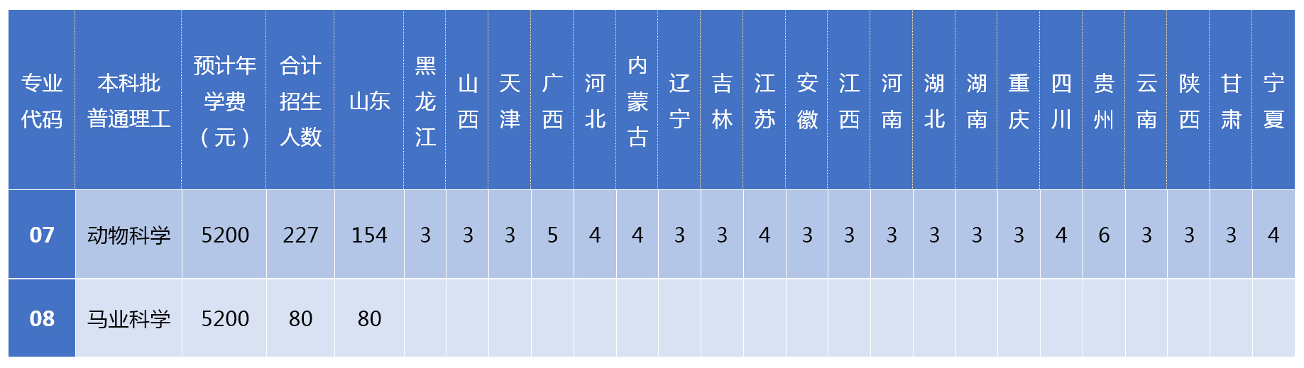 根据beat365亚洲体育官方网站2019年招生计划,beat365亚洲体育官方网站动物科学专业面向全国招生227人,面向山东省招收公费农科生33人,马业科学专业面向山东省招生80人。公司2019年普通高等教育本科招生计划共340人。以下标注专业代码为山东省,其他省份请参照当地《填报志愿指南》。