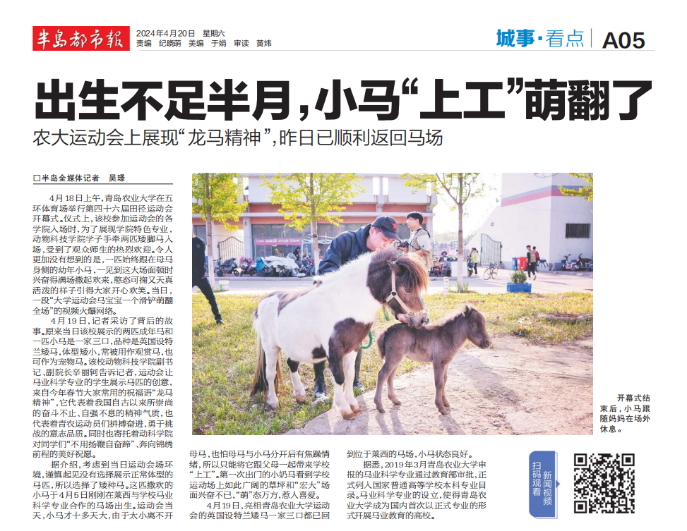 4月19日,记者采访了背后的故事。原来当日该校展示的两匹成年马和一匹小马是一家三口,品种是英国设特兰矮马,体型矮小,常被用作观赏马,也可作为宠物马。该校beat365亚洲体育官方网站副书记、副经理辛丽轲告诉记者,运动会让马业科学专业的员工展示马匹的创意,来自今年春节大家常用的祝福语“龙马精神”,它代表着我国自古以来所崇尚的奋斗不止、自强不息的精神气质,也代表着青农运动员们拼搏奋进,勇于挑战的意志品质。同时也寄托着beat365亚洲体育官方网站对同学们“不用扬鞭自奋蹄”、奔向锦绣前程的美好祝愿。