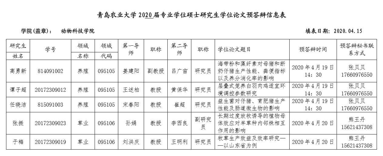 2020届专业学位硕士研究生学位论文预答辩信息表