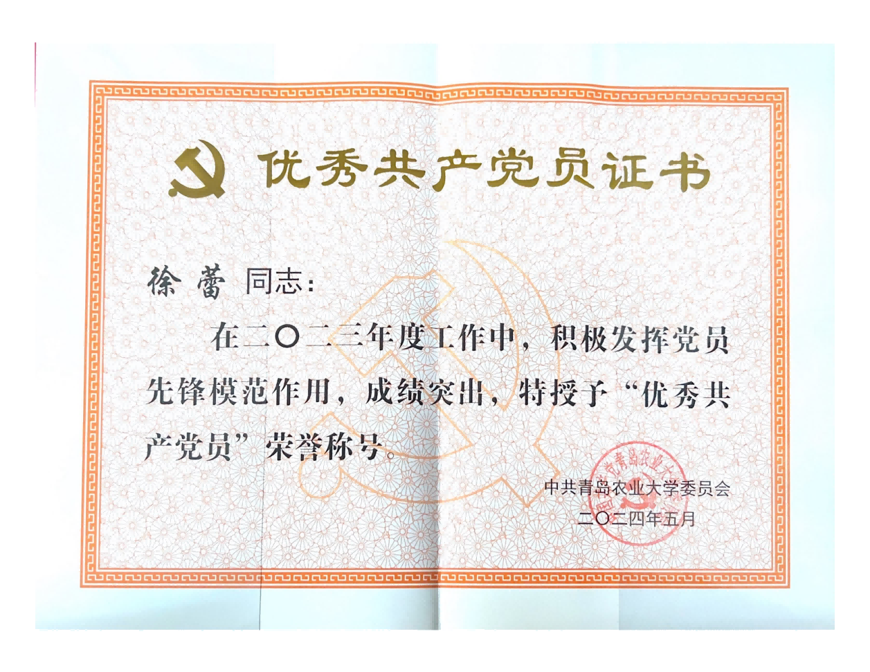 “立身以立学为先,立学以读书为本”,自入学以来,徐蕾始终保持着对知识的渴望和对学术的追求,刻苦钻研专业本领,力求打下扎实的专业基础,她的专业综合排名连续三年在前30%,连续三年获二等及以上学业奖学金。她积极申报各类科研项目,坚持每周阅读本专业的期刊文献,提升英语素养,在导师的帮助下,她逐渐探索出破解科研难题的有效方法。在完成学业任务的同时,她发表论文两篇,主持校级老员工创新创业训练项目1项,参与胶河黑山羊种质资源精准鉴定与高效扩繁体系建立、黄河三角洲肉羊种质特性挖掘与选育提升等项目。回忆研究生期间的学习,徐蕾感慨万千:“公司老师们在科学研究方面对我的指导,帮助我锻造了扎实的专业基础,让我有信心克服未知的科研挑战。”